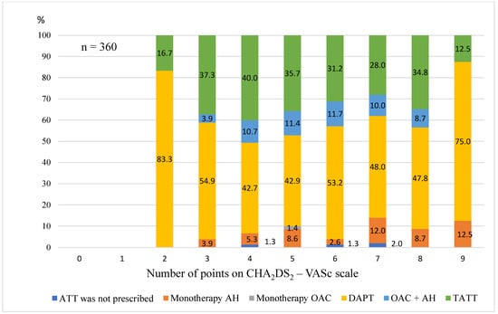 The latest cited research is of particular interest. It was conducted in China and during it, the researchers analyzed the frequency of prescribing ATT in changes from 2017 to 2019 []. Despite the fact that the majority of patients were still prescribed DAPT without OAC at discharge, the percentage of DAPT decreased from 70% to <50% at 3 years, p < 0.001. In the research conducted in Ryazan, from 2016 to 2017 to 2018–2019, the frequency of DAPT decreased from 76.9% to 37.9%.