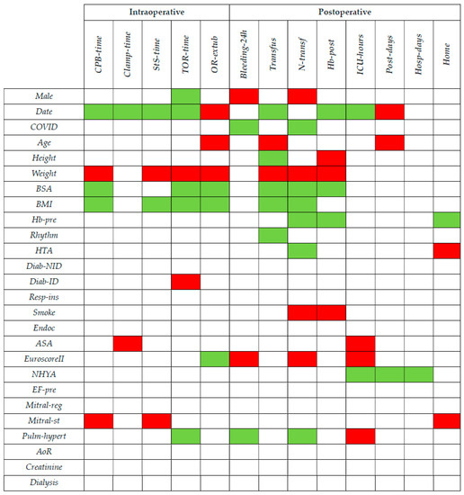 For a visual representation of these results, Figure 1 shows the covariates that were included by the AIC and had a relevant significance level, i.e., a p-value less than 0.05. A green cell indicates a relevant favorable effect (i.e., a reduction in CPB-time, Clamp-time, StS-time, TOR-time, Bleeding-24h, Transfus, N-transf, ICU-hours, Post-days or Hosp-days, an increase in OR-extub, Hb-post or Home), while a red cell indicates a relevant unfavorable effect (i.e., vice versa). For the covariates included with a quadratic value, the overall effect in the neighbor of the observed values (see Table 1) is considered, while for the categorical covariates, the effect is reported in terms of belonging to higher classes with respect to smaller.