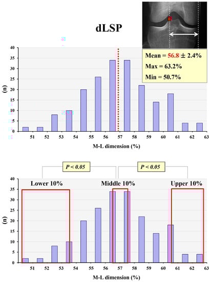 The mean and maximum/minimum values for dLSP and its variation. Red dot: peak point of lateral tibial spine, red dotted line and red font: mean value of dLSP, red frame: lower, middle, and upper 10% groups.