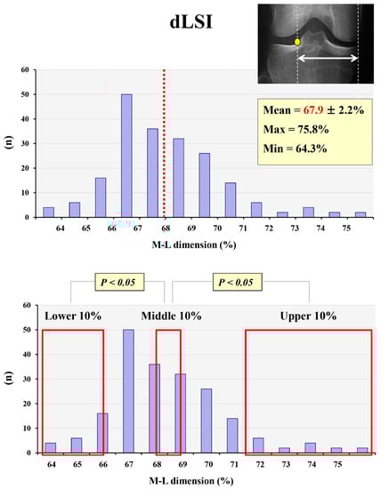 In the quantitative analysis of the lateral tibial spine position, the mean values of dLSP, dLSI, and dISP were 56.9 ± 2.5%, 67.9 ± 2.2%, and 16.5 ± 2.4%, respectively. The peak point and inflection point of the lateral tibial spine were located approximately 5% lower and 5% higher, respectively, than the conventional Fujisawa point (62–63%). However, both dLSP and dLSI varied broadly between individuals. The maximum and minimum values of dLSP were 64.5% and 52.4%, respectively, and the maximum and minimum values of dLSI were 75.8% and 63.4%, respectively. The upper 10% group showed significantly higher dLSP and dLSI than the middle 10% group (p = 0.001, p = 0.002); the lower 10% group also showed significantly lower dLSP and dLSI than the middle 10% group (p = 0.001, p = 0.001) (Figure 2 and Figure 3).