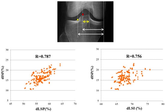 Correlation analysis between radiologic parameters. Yellow dot: inflection point of lateral tibial spine, red dot: peak point of lateral tibial spine, yellow arrow: dISP, shorter white arrow: dLSP, longer white arrow: dLSI.