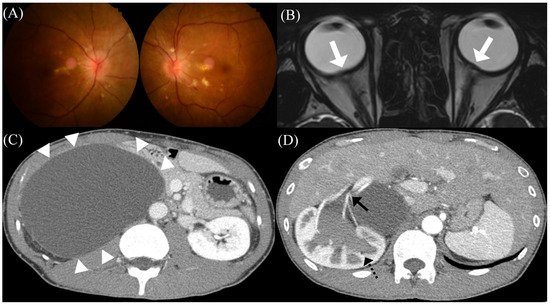 Initial clinical and radiological presentations of the patient. (A) Initial fundus photography showing bilateral papilledema and visible hard exudates at the posterior pole. (B) T2-weighted brain magnetic resonance images showing the flattening of the posterior sclera bilaterally, suggestive of intracranial hypertension (white arrows). (C) Abdominal computed tomography with contrast enhancement showing a huge benign cystic lesion (white arrowheads), (D) resulting in hydronephrosis (black dotted arrow) and (D) extrinsic compression of the renal artery of the right kidney (black arrow).