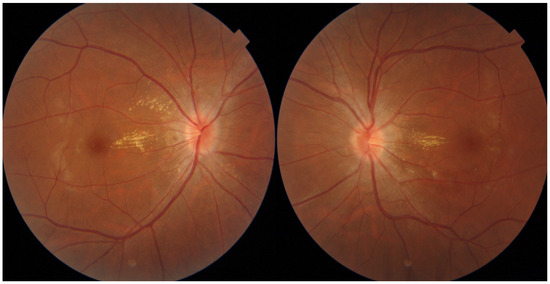Follow-up fundus photography of the patient. Follow-up fundus photography showing improved state of papilledema at three months after surgical removal of the cyst.