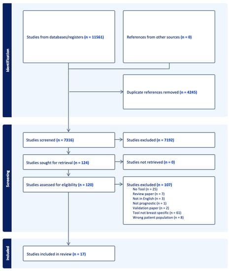 Flow diagram of literature search process for a systematic review of prognostic tools for older patients with breast cancer.