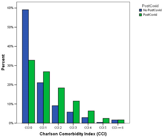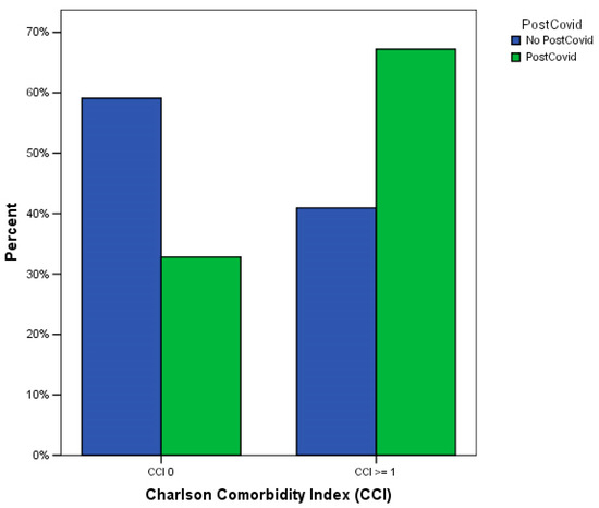 Patients with at least one CCI point developed more commonly a post-COVID-19 syndrome than patients with no comorbidities (p < 0.0001, chi-squared test), as shown in Table 4 and Figure 2.