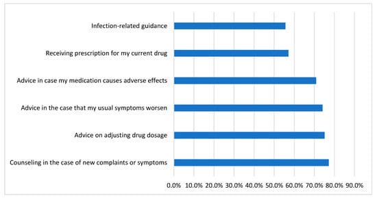 Figure 2 depicts rheumatic-disease-related medical disorders for which participants would prefer to receive teleconsultation advice. About 77% said they would use it for new complaint counseling, 75.1% for modifying prescription dosage, and 55.6% for infection-related advice.