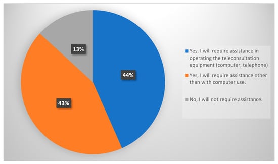 When asked if they would require assistance to engage in a teleconsultation, 44% of the respondents indicated that they would need assistance operating the teleconsultation equipment (computer, telephone), 43% would require support with teleconsultation beyond computer use, while 13% would not require assistance, as shown in Figure 3.