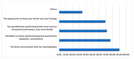 Furthermore, the participants were asked if they preferred TM or in-person visits for rheumatological consulting. Several questions were asked regarding what participants appreciated best about having direct contact with their rheumatologist during a traditional OPC consultation. Other information was gathered regarding the issues related to teleconsultations with rheumatologists and the counsel participants preferred to obtain via teleconsultation for their medical conditions.