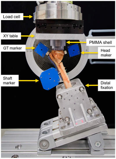 Biomechanical testing was performed at room temperature on a material testing machine (MiniBionix, MTS Systems Corp., Eden Prairie, MN, USA) equipped with a 4 kN load cell (HUPPERT 6, HUPPERT GmbH, Herrenberg, Germany). The setup was adopted from previously published work [26] (Figure 3). The humerus shaft of each specimen was aligned at a 25° adduction and connected to the machine base via a custom fixation clamp firmly holding the PMMA embedding. A concave PMMA shell, interconnected to the machine transducer via an XY table, was used for axial force transmission to the humerus head. The XY table was implemented to balance all shear forces and bending moments.