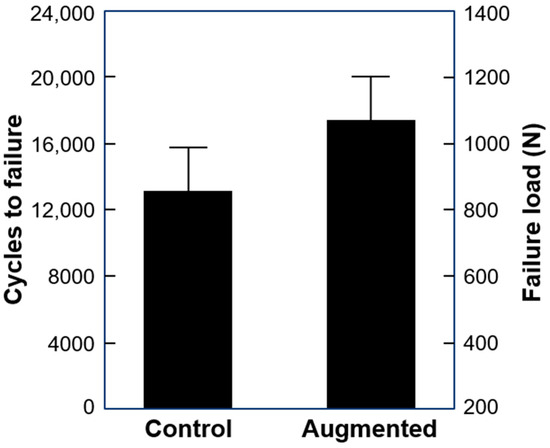 Cycles to failure and failure load were 13219 ± 2642 and 860.0 ± 332.1 N in the control and 17,552 ± 2638 and 1077.6 ± 331.9 N in the augmented group, with significant difference between them (p = 0.018) (Figure 4).