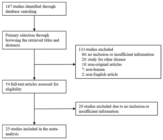 A total of 107 studies were found in the database search. In the review, 115 reports were excluded due to insufficient information. The remaining reports were excluded because they studied other diseases (n = 20), were non-original articles (n = 18), used animals or cell lines (n = 7), or were non-English (n = 2). Twenty-five articles were included in this meta-analysis and DTA review (Figure 1 and Table 1).
