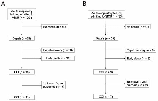Eighty-two patients met the criteria for medical sepsis, of which 31 (38%) developed CCI (Figure 1A). Seventeen patients met the criteria for surgical sepsis, of which 7 (41%) developed CCI (Figure 1B). Baseline characteristics for patients developing surgical CCI and medical CCI are shown in Table 1 and Table 2, respectively. Organ dysfunction scores during acute illness differed significantly between medical CCI patients and surgical CCI patients (p = 0.0017).