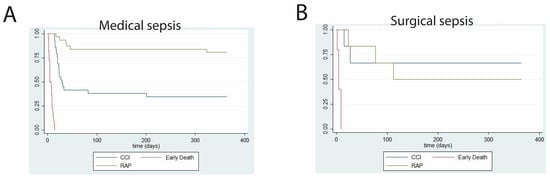 Medical and surgical patients who develop sepsis-related CCI have distinct risk factors and comorbidity profiles, and their clinical trajectory would, therefore, be expected to differ [,]. Patients with surgical sepsis typically undergo surgical procedures that lead to inflammation, acute blood loss, prophylactic antibiotic exposure, and secondary surgical complications (surgical site infections, deep venous thromboses with pulmonary thromboembolism, among others) [,]. Conversely, critically ill, non-surgical (medical) sepsis patients may have a greater burden of chronic medical comorbidities that affect their post-septic prognosis commensurately.