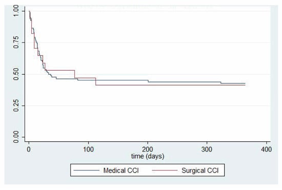 We report both short-term (Table 3) and long-term (Table 4) clinical outcomes in septic patients developing CCI. Interestingly, while surgical patients with CCI experienced significantly more ventilator-free days and significantly less residual organ dysfunction at 14 days post-sepsis, one-year outcomes between surgical and medical patients did not differ. One-year survival analyses, stratified by clinical trajectory, are shown for patients with surgical and medical CCI (Figure 2). A direct comparison between one-year survival in surgical versus medical CCI patients is shown in Figure 3. p-value was not calculated due to sample size.