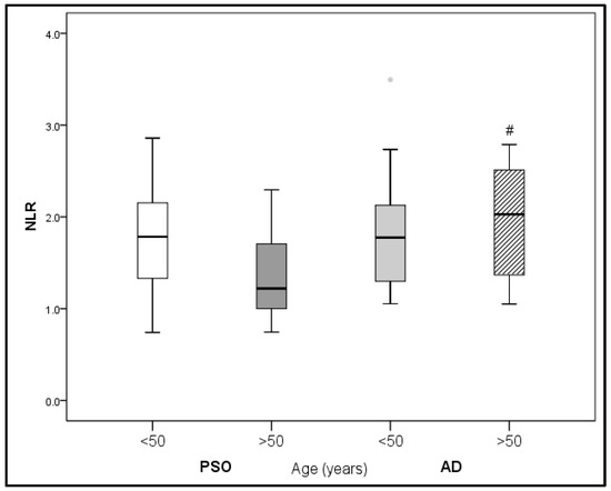 Comparison of NLR in PsO vs. AD according to age. # p < 0.05 vs. PsO (>50 years).