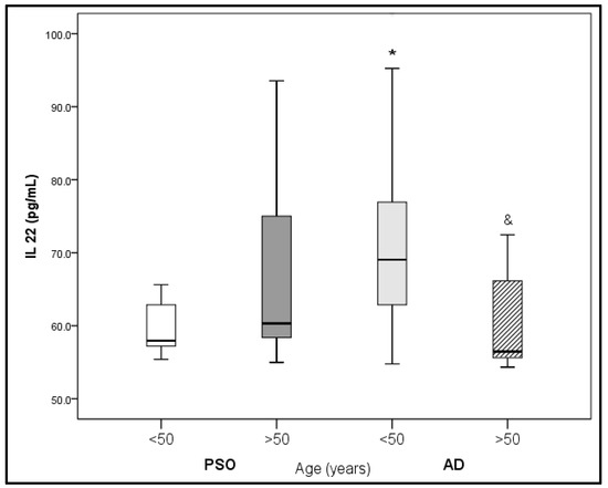 Comparison of IL-22 in PsO vs. AD according to age. * p < 0.05 vs. PsO (<50 years); & p < 0.05 vs. AD (<50 years).