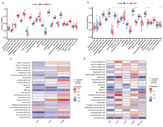 Landscape of immune infiltration in NASH patients and NASH to HCC patients. (a,b) Box plot presenting the proportion of immune cell infiltration in patients at different stages. (c,d) Heat map of the correlation between key CRGs and immune cells. p < 0.05 = *, p < 0.01 = **, p < 0.001 = ***.