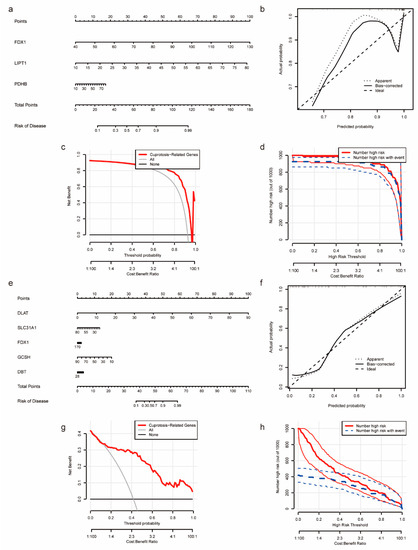 In order to provide targeted diagnostic and therapeutic advice to patients suffering from NASH or HCC, we developed nomogram models for the NASH patients (utilizing FDX1, LIPT1, and PDHP expression) and the NASH to HCC patients (utilizing FDX1, DBT, GCSH, SLC31A1, and DLAT expression) (Figure 3a,e). As evidenced by the calibration curves, the nomogram model based on CRGs showed a high degree of prediction accuracy and similarity with the actual positive rate (Figure 3b,f)). A Decision Curve Analysis (DAC) and a clinical impact curve analysis (CICA) showed that the nomogram model constructed from the copper-death-related genes is important for patients who have progressed from NASH to HCC (Figure 3c,d,g,h).