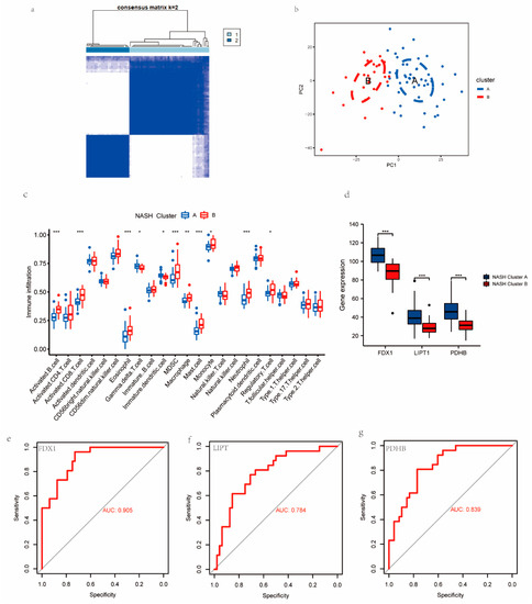 Establishing NASH CRCs based on key CRGs. (a) Two NASH CRCs were established using the NFM algorithm, consensus matrix (k = 2). (b) PAC analysis of NASH Cluster A and NASH Cluster B. (c) Infiltration of 23 immune cells in NASH Cluster A and NASH Cluster B. (d) Expression of FDX1, LIPT1, and PDHB in NASH Cluster A and NASH Cluster B. p < 0.05 = *, p < 0.01 = **, p < 0.001 = ***. (e–g) ROC analysis results on FDX1, LIPT1, and PDHB.