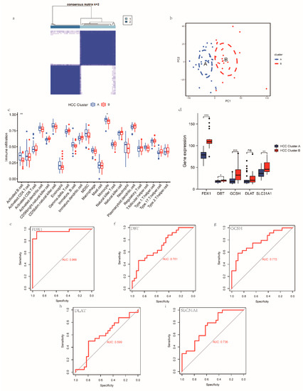Establishing HCC CRCs based on key CRGs. (a) Two HCC CRCs were established using the NFM algorithm, consensus matrix (k = 2). (b) PAC analysis of HCC Cluster A and HCC Cluster B. (c) Infiltration of 23 immune cells in HCC Cluster A and HCC Cluster B. (d) Expression of FDX1, DBT, GCSH, DLAT, and SLC31A1 in HCC Cluster A and HCC Cluster B. p < 0.05 = *, p < 0.01 = **, p < 0.001 = ***. No statistical significance is denoted by ns. (e–i) ROC analysis results on FDX1, DBT, GCSH, DLAT, and SLC31A1.
