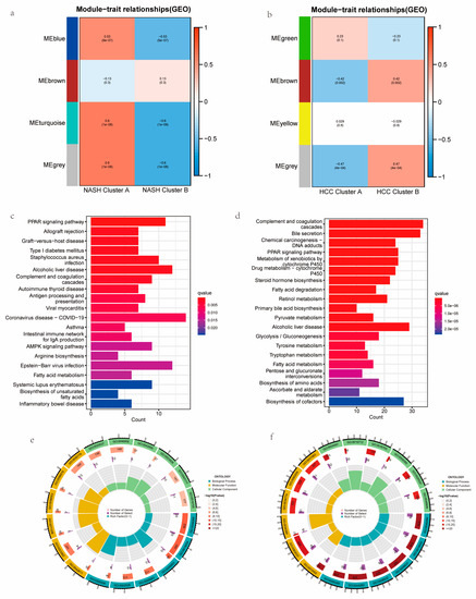 Functional enrichment analysis of core module genes of co-expression network between NASH CRCs and HCC CRCs. (a) Selection of core modules in NASH CRCs. (b) Selection of core modules in HCC CRCs. (c) KEGG analysis of the NASH CRC gray module. (d) KEGG analysis of the HCC CRC gray module. (e) GO analysis of the NASH CRC gray module. (f) GO analysis of the HCC CRC gray module.