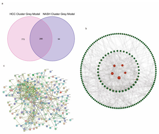 PPI analysis of overlap genes in NASH CRCs and HCC CRCs. (a) NASH CRC gray module and HCC CRC gray module overlapping genes. (b) PPI network diagram of overlapping genes. (c) The top 5 hub genes were calculated using betweenness centrality algorithm. The genes in the red circles have high correlation.
