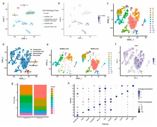 Analysis of Fdx1 expression in mouse immune cells using single-cell analysis. (a,b) Tabula Muris tool displaying the expression of Fdx1 in different immune cells of mice. (c) t-SNE plots showing multiple cell subpopulations. (d) Specific notes of 11 cell clusters. (e) t-SNE plots comparing immune cell heterogeneity in healthy liver and NASH liver. (f) t-SNE plots showing the expression of FDX1 on immune cells. (g) Proportional differences of 11 cell clusters. (h) Dot plot showing the most representative genes in the 11 cell clusters.