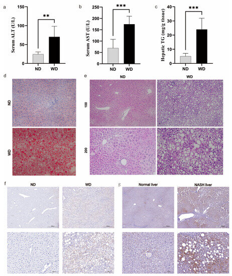 To explore FDX1′s impact on NASH development, we established a NASH model using a Western diet. We then gauged serum ALT and AST activity, alongside liver TG content, in both the ND and WD groups. There was a significant difference between the WD and ND groups in terms of the levels of ALT, AST, and TG activities (Figure 9a–c). Lipid droplets in the WD group were much larger and more numerous than those in the ND group (Figure 9d). The ND group had no liver lesions, whereas the WD group had hepatic steatosis, lobular inflammatory lesions, and ballooning of hepatocytes (Figure 9e). The above experimental results sufficiently illustrate the reliability of our NASH model construction. FDX1 was widely expressed around hepatocyte steatosis, as shown in the IHC results; this result was consistent in both the mouse NASH samples and human NASH samples (Figure 9f,g). In conclusion, the experimental results are consistent with our bioinformatics analysis, suggesting that FDX1 may affect the course of NASH.