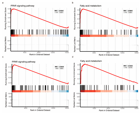 We aimed to comprehensively investigate the impact of FDX1 on signaling pathways during the progression from NASH to HCC among patients. We performed separate GSEA analyses for NASH patients and patients with NASH who progressed to HCC. We were surprised to find that the PPAR signaling pathway and fatty acid metabolism were inextricably linked in the NASH patients (Figure 10a,b) and HCC patients with NASH (Figure 10c,d). The specific GSEA results are presented in Supplementary Table S5.