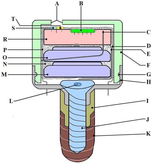 The MICROSAL device (MD) scheme: (A) main hole from the upper case (made for the sensors to be in contact with saliva), (B) microcontroller, (C) mini-antenna used for sending signals to the smartphone via Bluetooth technology, (D) one of the electrodes used for stimulation, (E) a wire which makes the connection to the batteries and activates the system when it is put in its case, (F) the upper part of the case, made from polypropylene, (G) the fastening elastic system (clips), (H) the downer part of the case, made from titanium alloy, (I) a metallic extension, also made from titanium alloy, (J) implant central cover screw, (K) the dental implant, Tehnomed system™, (L) the central part of the screw, (M, O) batteries, (N) the coating material (PanacolVitralit 2004 F), (P) the second electrode for stimulation, (R) printed circuit board (PCB), and (S, T) wetness and pH sensors.