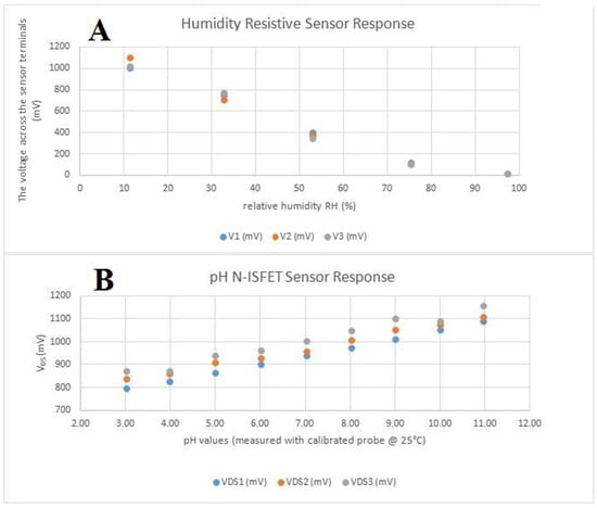 In vitro tests of the two sensors: (A) the humidity-resistive sensor response; (B) the pH N-ISFET sensor response.