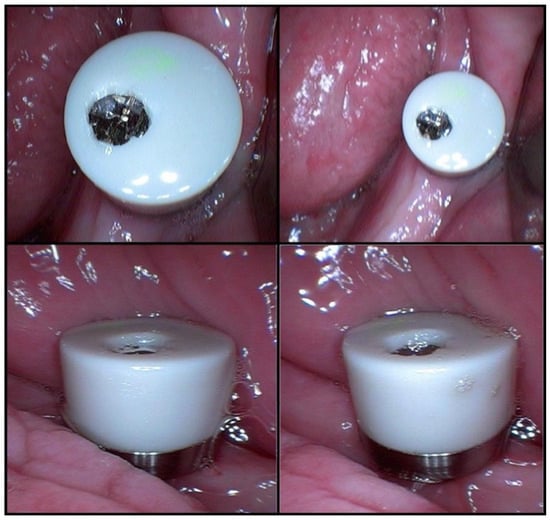 The MD mounting procedure is straightforward: firstly, the healing abutment is removed from the dental implant using a Tehnomed (Tehnomed, Bucharest, Romania) screwdriver. Afterward, a screw (Figure 1J and Figure 2E,G) fixes the lower part of the case (Figure 1H and Figure 2H) first onto a metallic extension also made from titanium alloy (Figure 1I and Figure 2F) and then onto the dental implant (Figure 1K and Figure 2I). Note that the metallic extension is custom-made according to the oral mucosa thickness around the dental implant. The micro-system is then placed in the lower case (Figure 2K), carefully passing the electrodes (coated in PV except the tips) through the two orifices. Finally, the upper case is fixed with the clips inside (Figure 2L). The connection between the two parts of the case is very strong, and they can be separated only by the dentist using a metallic instrument.