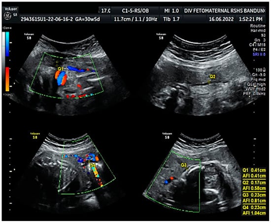 Ultrasound examination showed a cephalic lie fetus with biometry (biparietal diameter (BPD), head circumference (HC), abdominal circumference (AC), and femur length (FL)) equal to 26–27 weeks of gestation; the gestational age based on the last menstrual period was 30 weeks. The Transcerebellar diameter was equal to 29–30 weeks of gestation, and the amniotic fluid volume suggested oligohydramnios with an amniotic fluid index (AFI) equal to 1.04 cm, with an estimated fetal weight (EFW) of 956 g (<10th percentile for gestational age) (
