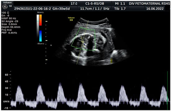 Color Doppler examination of the MCA revealed a peak systolic velocity of 42.33 cm/s, which is 1.045 times the median (the normal range is 40.5 cm/s for this gestational age), with persistent reversed end diastolic flow (