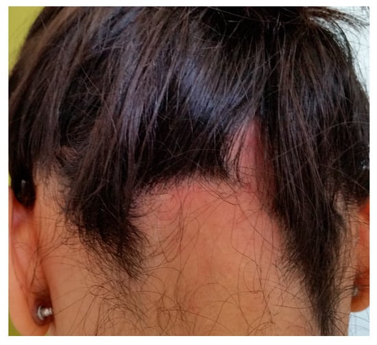 The immune-dependent disease known as AA is defined by the interaction of T cells with follicular antigens. Studies have revealed the presence of a local renin–angiotensin system in the skin, where the angiotensin-converting enzyme (ACE) is involved in autoimmunity and causes alopecia due to HF’s chronic inflammation [20,21]. A few cases of non-cicatricial alopecia induced by ACE inhibitors have been identified. Lisinopril-induced alopecia in a patient of Kataria et al. [10] and enalapril-induced alopecia in a patient of Ahmad et al. [22] were reported. Hair re-growth was observed after the cessation of the treatment. A patient of Motel et al. received ACE treatment for one month, and after the medication was stopped, hair thinning was observed at a follow-up examination [12].