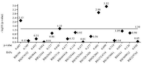 The value of the base-10 logarithm of the p-value is always negative because the p-value takes values between 0 and 1. For this reason, for the representation of positive values on the Oy axis, the value of the logarithm minus (-log10 (p-value)) was used. The significance threshold considered was 0.05 -log10 0.05 = 1.30, the constant value, represented as a horizontal line. Statistically significant values had a p-value <= 0.05. For these, the -log10 values are above the line corresponding to p-value = 0.05, e.g., above 1.30. It is confirmed that the four values greater than 1.30 correspond to the SNPs in Table 5.