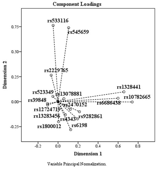 The Variance Accounted For table (Table 3) shows the coordinates of each element on each dimension relative to the centroid (0, 0). Furthermore, features with a very small mean coordinate indicate that these elements do not contribute substantially to the principal components. The SNPs rs39848 (SRD5A1 gene), rs523349 (SRD5A2 gene), rs12724719 (CRABP2 gene), and rs13078881 (BTD gene) have mean values less than or equal to 0.010, meaning they do not adequately contribute to the principal components. After transforming the variables through the optimal analysis approach, the Correlation-Transformed Variables table (Table 4) shows the correlations between the components. We observed that the elements contributing substantially to the main features have an eigenvalue > 1.