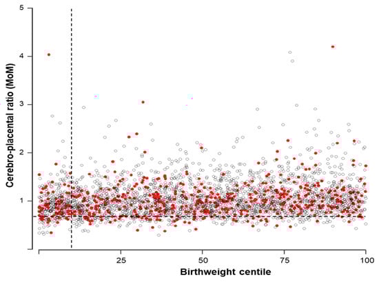 Distribution of the 3143 pregnancies according to birthweight and cerebroplacental ratio multiples of the median (MoMs). White dots represent uneventful cases, and red dots are those ending with an adverse pregnancy outcome. The interrupted horizontal line represents the 10th CPR MoM, and the interrupted vertical line represents the 10th birthweight centile.