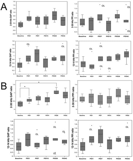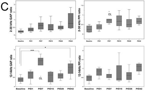 The results of the ASR and PPI temporal screening in the sham, blast, and SSIT cohorts are presented in Figure 1. As shown in Figure 1B, in the broadband (2–30 kHz) range of the blast group, we observed a significant effect at the two time points: PID1 and PID28 (F(5,20) = 6.07, p = 0.001). A post hoc t-test revealed significant differences between the baseline and PID1 (p = 0.002) and between baseline and PID28 (p = 0.001). The SSIT group data are presented in Figure 1C. We found that, at any time point, the PPI ratios were affected when the broadband noise (top panels, Figure 1C) and 12–14 kHz frequency band (Figure 1C, bottom right panel) were used. However, the GAP ratio at 12–14 kHz was significantly increased at PID7 and PID28. These results resemble trends in previous reports wherein the 10–20 kHz frequency band caused the most tinnitus after overdosing on sodium salicylate [].