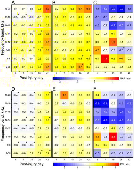 The results of acoustic startle response GAP (A–C) and PPI (D–F) evaluation in SSIT (A,D), sham (B,E), and BLAST (C,F) cohorts. The presented time-series data are average responses with subtracted baseline prescreening values. Statistical significance is indicated with asterisk (*, p < 0.05). The negative values indicate the decreasing response compared to baseline. Large inhibitory trend is evident in high-frequency bands in animals exposed to a single blast in both tests. This effect is relatively weak, and most of the time-frequency band groups are above the statistical significance threshold.