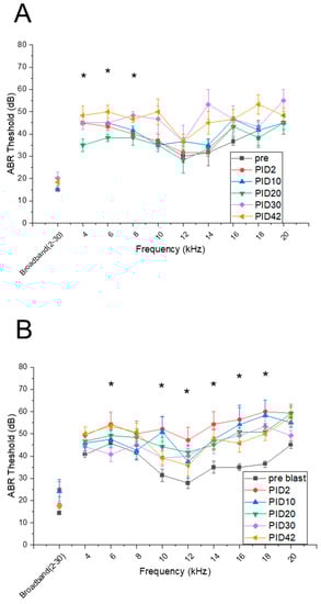 3.2. Blast Increases Thresholds of Auditory Brainstem Responses