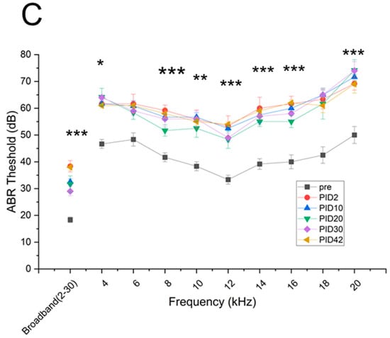 The ABR thresholds for different test groups are shown in Figure 3. The sham group results indicate there was no significant change compared with baseline and PID2 (Figure 3A). At other combinations of time points and frequencies used in our experimental design, there are no clear trends with relatively large variability among the data (20–60 dB range). Only in a few instances was there a departure from the baseline (marked as PRE below). Specifically, the ABR thresholds have increased at lower frequencies of 4, 6, 8 kHz: (1) 4 kHz: PID20-PID40 (p = 0.013), PID20-PID (p = 0.048) and PID20-PID30 (p = 0.025), (2) 6 kHz: PRE-PID42 (p = 0.028), PID2-PID10 (p = 0.040), PID2-PID42 (p = 0.004), PID20-PID42 (p = 0.006), PID20-PID30 (p = 0.046), (3) 8 kHz: PID2-PID30 (p = 0.005), and PID2-PID42 (p = 0.001).