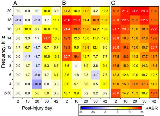 The auditory brainstem response thresholds after: (A). noise exposure (sham), (B). 180 kPa blast, and (C). Continuous sodium salicylate injection. The heatmap of differential ABR threshold values (treatment group data with subtracted baseline data, i.e., those taken before the treatment) are presented. Both cohorts of animals subjected to noise and blast exposure had their ears protected by earplugs to avoid tympanic membrane rupture.