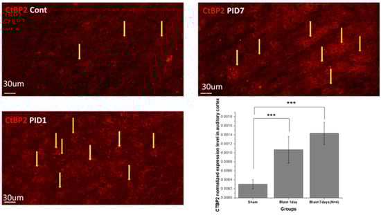 Carboxyl terminal binding protein (CtBP2) expression. The normalized CtBP2 expression characterized by the intensity of the immunohistochemistry is shown in Figure 5. Compared with the sham group, the expressions of CtBP2 at post-blast day 1 and day 7 were both significantly increased.