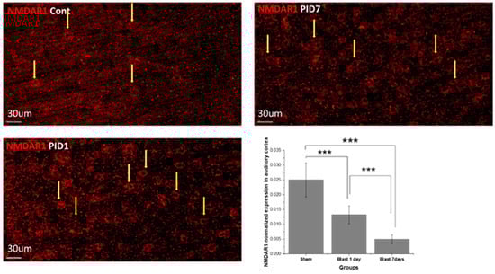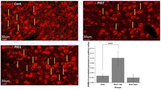 GABA A receptor α1 participates in opening Cl− channels and leads to hyperpolarization of the post-synaptic cell with other subunits, while α1 and γ2 are involved in phasic inhibition. Phasic inhibition decreases the hyperexcitability of the post-synaptic cell and plays an important role in the creation and modulation of theta and gamma oscillations []. These oscillations are critical in maintaining neural functions. Recent studies also showed these oscillations as the biomarkers of major mental illness, including depression [,]. Our data showed increased GABA A receptor level at post-blast day 1, which suggested that the cortex region has compensatory changes in response to the increased neural traffic from the ascending auditory pathway. In the sodium salicylate-injected animal, GABAergic inhibition is overall decreased in the auditory cortex. This suggests different mechanisms of hearing impairment concerning drug and blast-induced effects. The NMDA receptor (NMDAR) has the role of customized synaptic plasticity and long-term potentiation and potentially contributes to diseases such as schizophrenia and Alzheimer’s disease. Within all subunits, NMDAR1 binds glycine, responsible for receptor deactivation. The functional NMDAR1 is essential for the activity of the NMDAR receptor []. Our results show the strong, persistent compromised NMDAR1, which leads to NMDAR malfunction or even neural death.