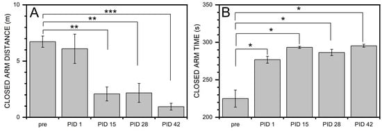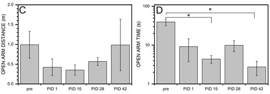 The data presented in Figure 8 revealed that continuous sodium salicylate overdosing leads to a dramatic decrease (3 to 6 times) of closed-arm distance traveled after two or more weeks (PID15 to 42) compared with baseline: (1) PID15 (p = 1.7 × 10−4), (2) PID28 (p = 3.2 × 10−4), and (3) PID42 (p = 6.4 × 10−4). At PID42 compared with PID1, p = 0.007. Simultaneously, animals required more time to complete this task at all four-time points in our experimental design compared to baseline: PID1 (p = 0.002), PID15 (p = 1.4 × 10−4), PID28 (p = 0.001), and PID42 (p = 3.6 × 10−4). The trends observed in the open-arm task are not as dramatic, as illustrated by the lack of changes in the open-arm distance task. However, the time to complete the open-arm task compared with the baseline was significantly reduced at PID15 (p = 0.001) and PID42 (p = 0.002).