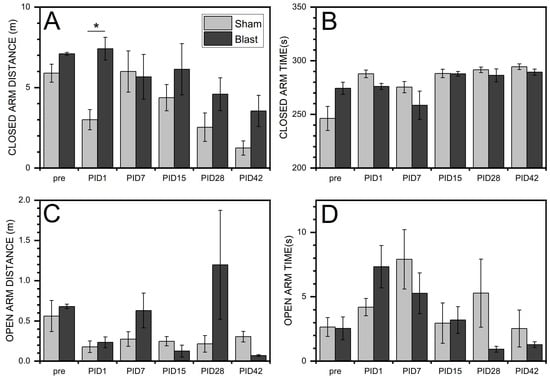 Summary of EPM among sham and blast conditions: significant increase of the closed arm traveled distance in the BLAST group compared with sham group. (A) Closed arm distance; (B) Closed arm time; (C) Open arm distance; and (D) Open arm time. Repeated measure ANOVA was used for the statistical analysis of behavioral tests, with the following significance thresholds: * p < 0.05.