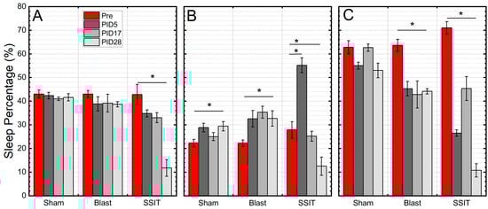 Our results demonstrate that, compared with sham, blast causes increased sleep in the dark (Figure 10B) and reduced sleep in the light (Figure 10C), while the whole sleep percentage was not significantly changed (Figure 10A). For sleep percentage in the light, at day 17 and 28 there was a significant difference compared sham with blast (p = 0.017, p = 0.043). For in the dark sleep, at day 17, there was a significant difference compared with sham (p = 0.008).