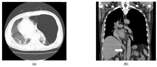 Other diseases and surgical history were denied. His vital signs in the emergency room were stable with a blood pressure (BP) of 145/90 mmHg, a heart rate (HR) of 89 bpm, a respiratory rate of 20 per minute, a SpO2 level of 97%, and a body temperature of 36 °C. An abdominal CT scan showed active bleeding in the right rectus sheath muscle and hemoperitoneum. Thus, emergency surgery was decided upon. There were no abnormal preoperative laboratory findings or electrocardiographic findings. A chest X-ray showed a large radiolucent area of the left lung with contralateral mediastinal deviation, so the emergency medicine physician suspected a pneumothorax. The pneumothorax seen on the X-ray was large, but the patient had no pneumothorax symptoms, such as dyspnea or chest pain. Therefore, a chest CT was performed. However, the CT showed a GEB in the left lung and bullous emphysema in the right lung with displacement of the mediastinal structures (Figure 1a and Figure 2a). In cases with GEBs, unlike with a pneumothorax, chest tube drainage (CTD) is not placed because the bullae could be damaged and tension pneumothorax could occur. Although the patient had no symptoms of dyspnea, it was decided to remove the GEB first and then perform abdominal surgery in consultation with a thoracic surgeon, since the GEB could affect the patient’s vital signs during positive pressure ventilation.