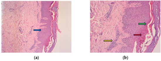 Histologic findings typically of psoriasis: epidermal hyperplasia (blue arrow), parakeratosis (green arrow), Munro’s micro abscesses (red arrow), thinned granular cell layer of the epidermis, dilated dermal capillaries, and inflammatory infiltrate in the upper dermis (yellow arrow). (a) HE 10× and (b) HE 30× magnification.